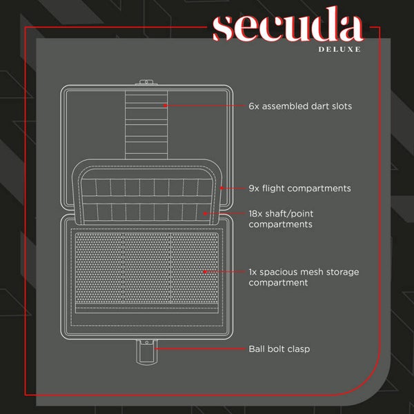 Ruime opslag: Deze ruime case biedt veilige opslag voor maximaal 6 volledig gemonteerde darts. Daarnaast beschikt hij over 9 vakken voor flights, 18 vakken voor shafts of punten, en een groot opbergvak voor extra items zoals een slijpsteen, reserveflights of andere dartaccessoires. De case is ook compatibel met populaire gegoten flights.