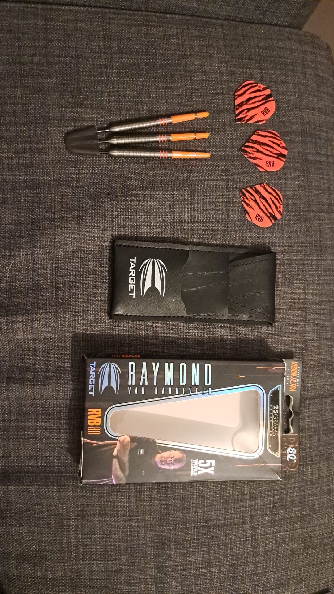 De bijgeleverde shafts zijn nieuw en origineel. De flights zijn nieuw, niet origineel maar wel van het merk en speler in kwestie.